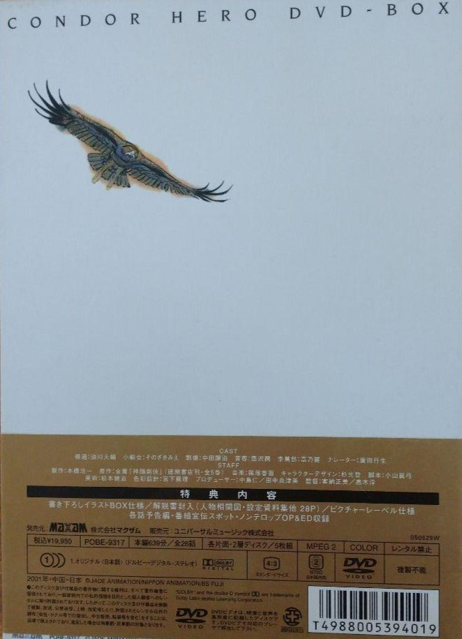 The Return of the Condor Heroes Anime Series DVD Box Set. Total 26 episodes in 5 discs. Released in 2005. Dolby Digital Stereo. No subtitles.Cast: